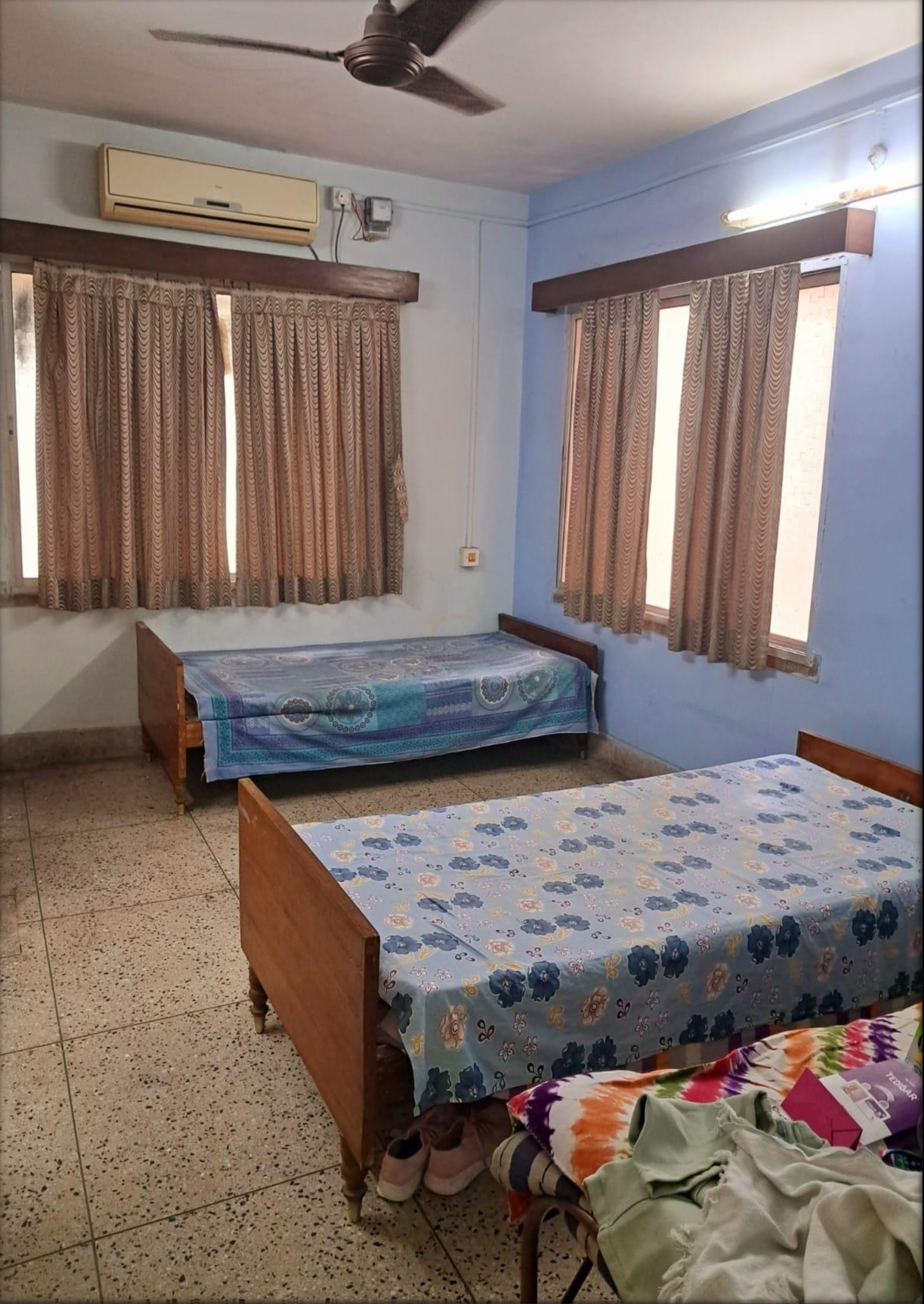 • Furnished rooms with beds, wardrobes, study tables, and basic amenities like fans, lighting, and curtains.